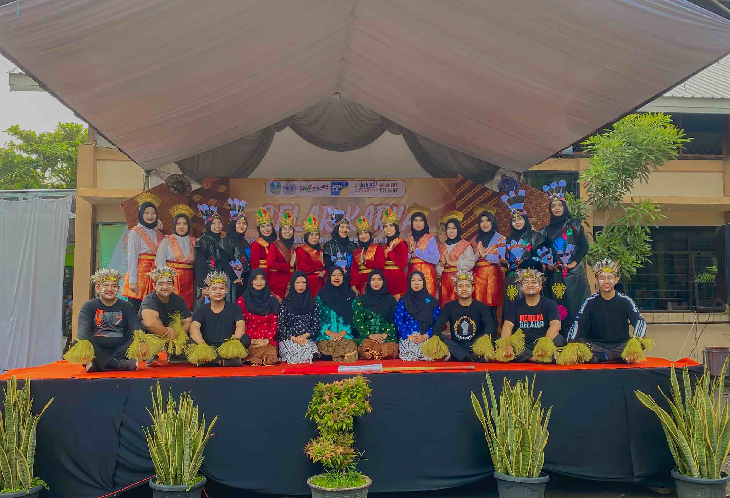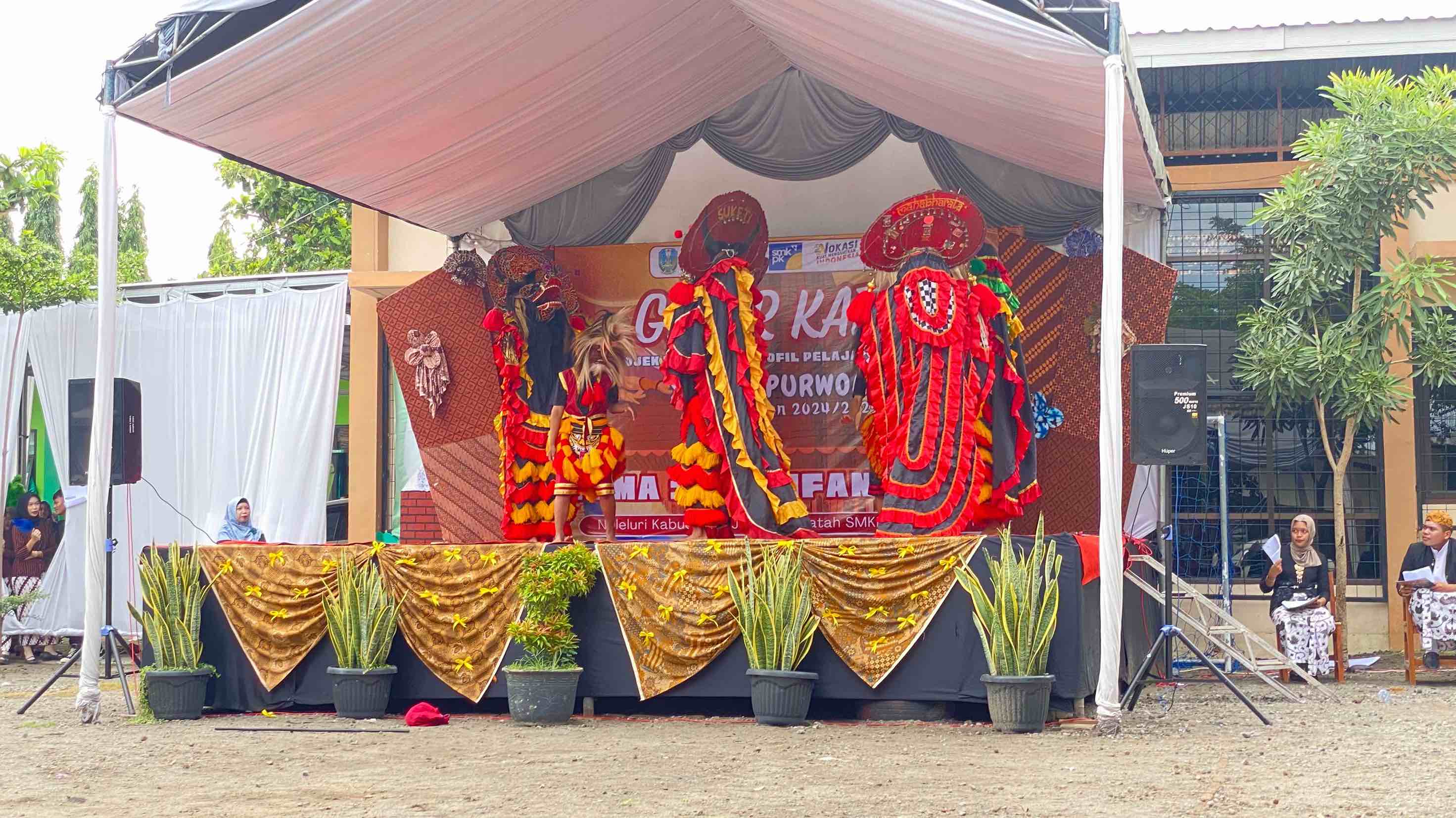 Dilanjutkan sambutan sekaligus pembukaan acara Gelar karya yang di tandai dengan pemukulan gong sebagai simbol pembukaan Acara P5 oleh bapak Nur Rokhim S.Pd selaku Wakil Kepala SMKN 1 Purwoasri. Yang kemudian dilajutkan dengan penampilan pagelaran drama cerita rakyat dan kesenian daerah dari kelas X dan kelas XI. selain itu bapak ibu guru di akhir acara memberikan tampilan tarian adat dari berbagai suku di Indonesia sebagai bentuk partisipasi dalam memeriahkan acara Gelar Karya P5.