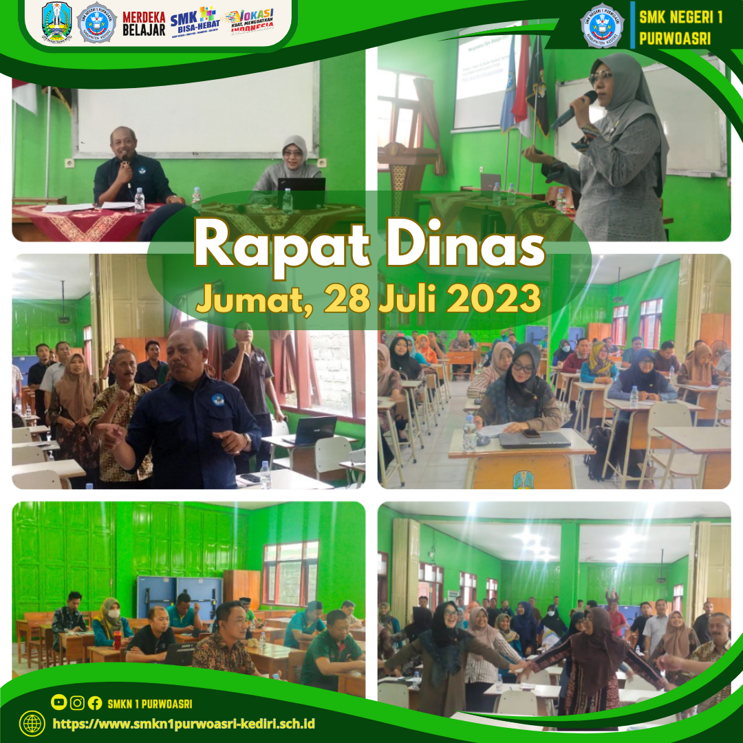 Rapat Dinas SMK Negeri 1 purwoasri, Jumat 28 Juli 2023. Rapat ini dipimpin oleh Bapak Jatmiko, M.Pd., selaku Kepala SMKN 1 Purwoasri dan dihadiri oleh semua bapak ibu dewan guru. Rapat ini juga di hadiri oleh Ibu Pengawas Pembina yaitu Ibu Niken Peni Wardani, S.T., M.T. yang memberikan materi tentang Implementasi Kurikulum Merdeka serta projek penguatan profil pelajar pancasila.